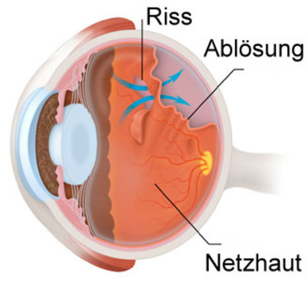 Die Netzhaut (Retina) kleidet den Innenraum Ihres Auges aus. Sie verarbeitet die Bilder, welche Sie sehen und sendet diese zum Gehirn. Ein Netzhautriss kann dazu führen, dass sich die Netzhaut von ihrer Unterlage ablöst (Netzhautablösung). Dies kann zu einem partiellen oder kompletten Sehverlust führen.